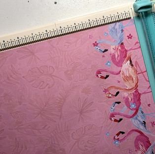 I cut the small strip of flamingos down to 6-1/4" in length. Since I still had excess of the gradient sheet due to creating a nontraditional greeting card size, I cut it down to a size slightly larger than the small strip of flamingos.