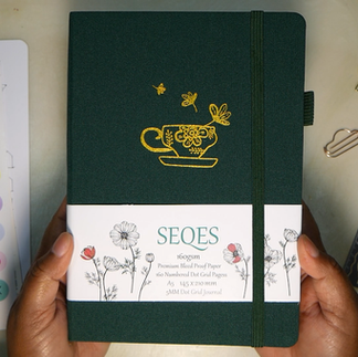 A new year means a new dotted journal for me. I got the SeQeS A5 dotted journal notebook (coffee design) with gold guilded edges from Amazon.com for $24.95 USD. This is my second SeQeS dotted journal. I used the ginko leaf design with silver guilded edges all through 2025.