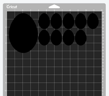 I opened Cricut Design Space and uploaded the egg silhouette image as a cut file. I duplicated the image, creating 9 egg shapes at 2" in height. I also had a single egg at 5" in height because I failed to measure my cards beforehand. The 5" in height is perfect for use with an A2 size greeting card.