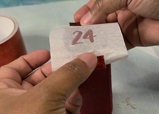 I cut the tissue paper larger than the rolls' openings and numbered each piece with a metallic brush marker. I used a bronze color to number the green tissue paper. It was legible, but I wished I used a white marker instead. The red color I used to number the white tissue paper was very easy to read.